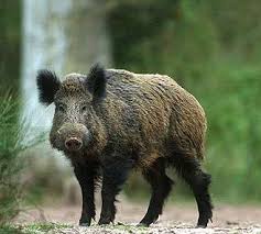 Preferiblemente, escogerá zonas con alta vegetación y abundante agua, donde pueden camuflarse, especialmente bosques de encinas. Su alimentación es muy variada al tratarse de un omnívoro; frutos, bellotas, insectos, roedores, setas e incluso carroña.